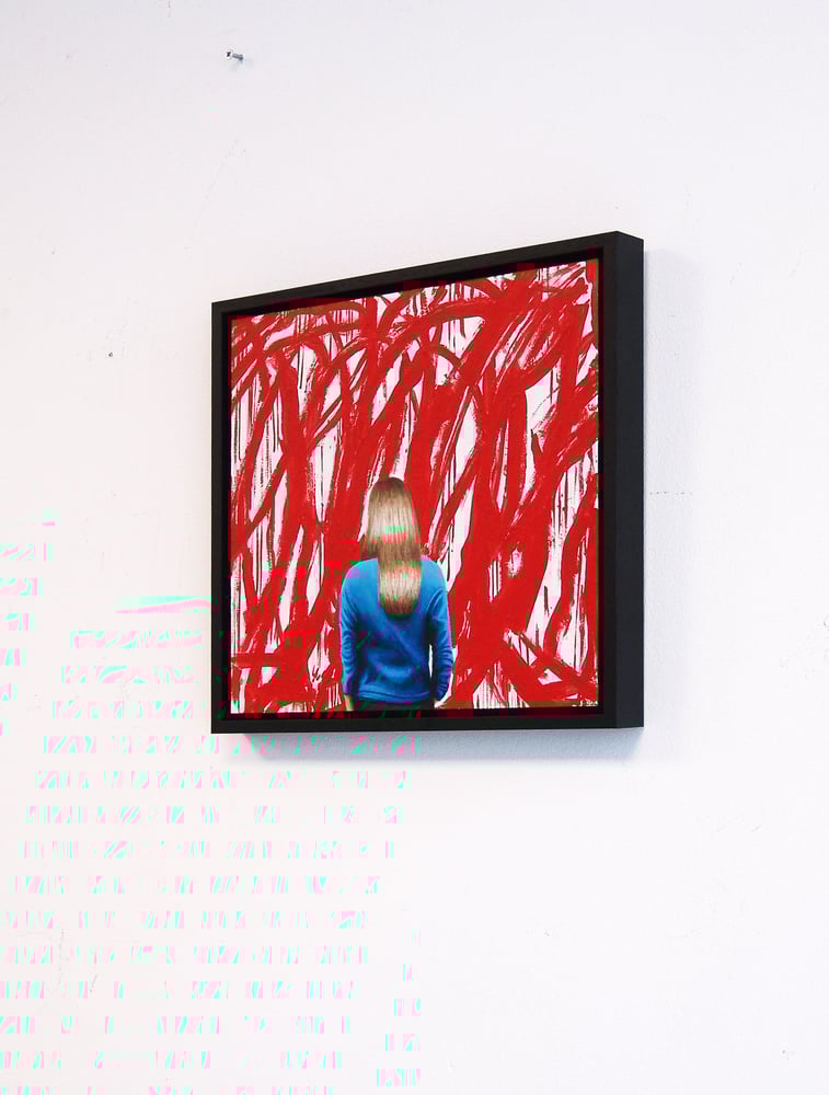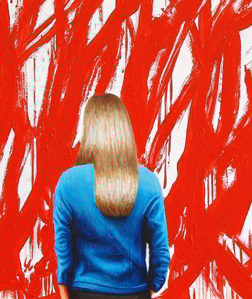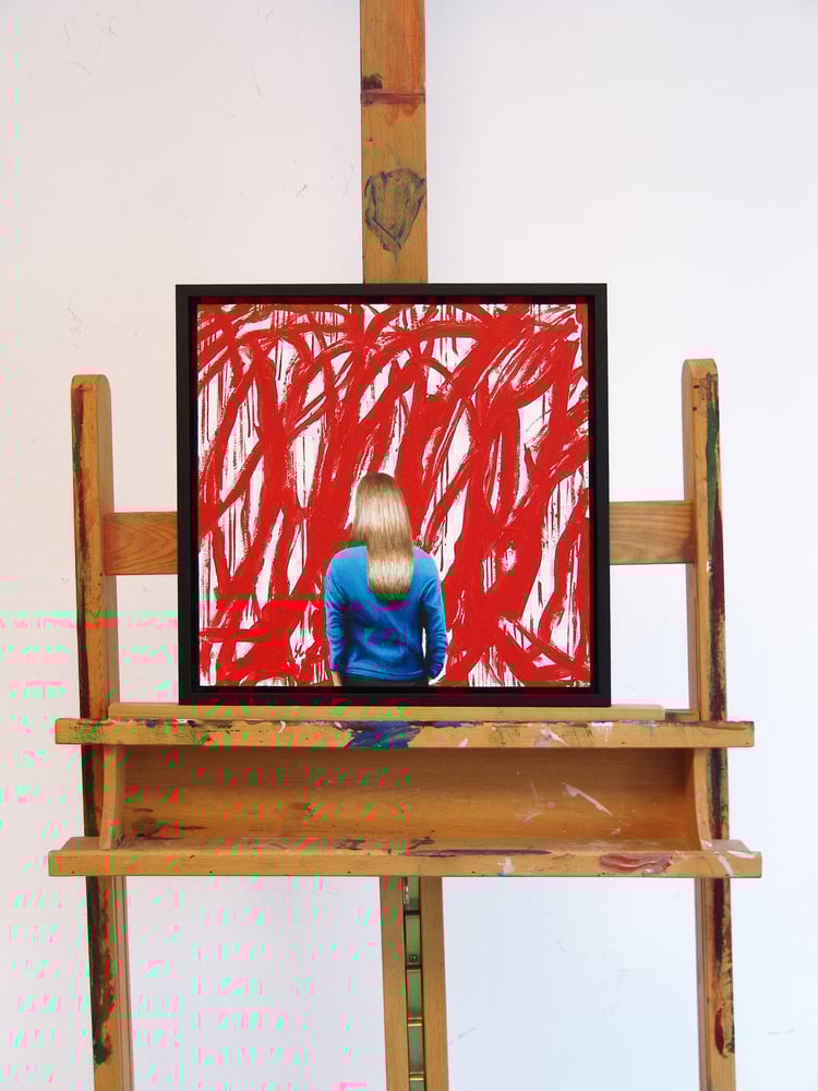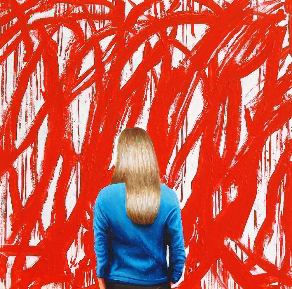 The woman on my painting is enjoying a painting by Cy Twombly. Best-known are Twombly's large-scaled works of freely-scribbled and calligraphic works on solid fields of mostly off-white colors. Twombly allowed the practice of writing, a free hand, an untethered mind and soul to dictate his strokes and scribbles.