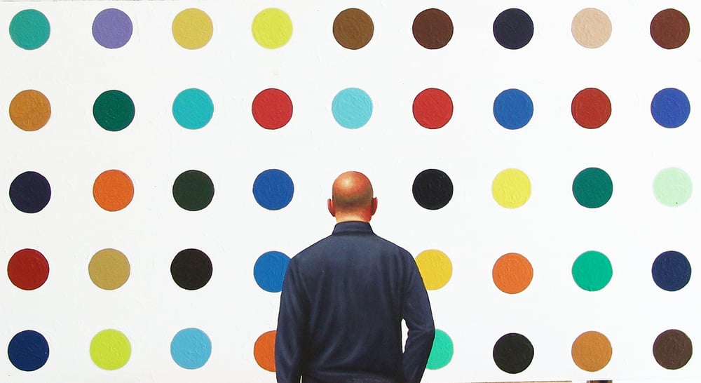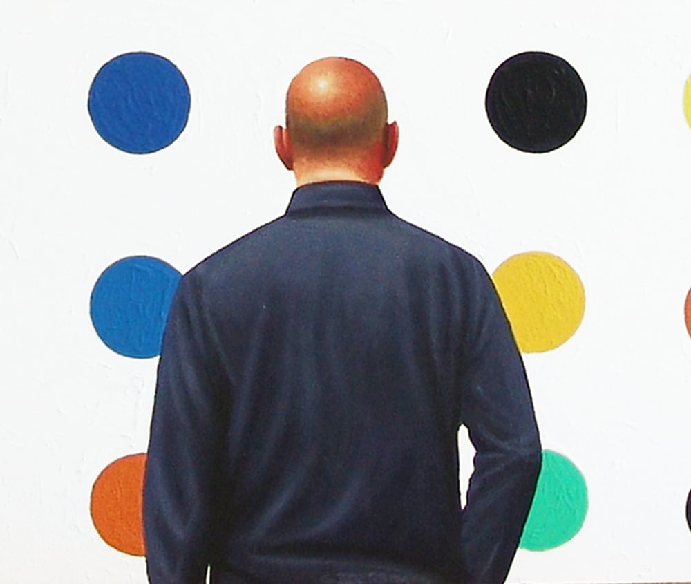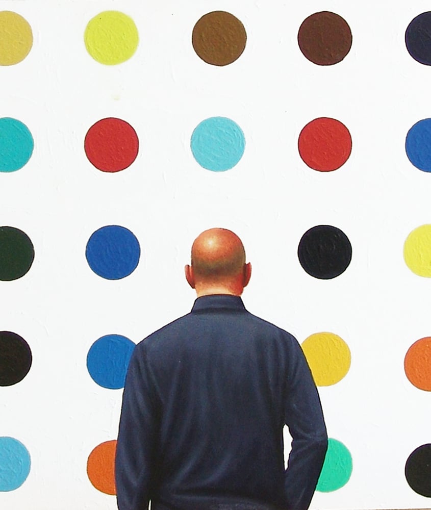 painting shows a man enjoying a painting by Damien Hirst