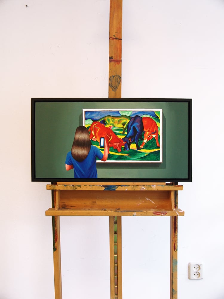 This painting shows a woman enjoying a painting by Franz Marc. To him bulls symbolize immense, raw, and untamed physical power and vitality. They also served as a vehicle to convey spiritual ideas, using a color theory where blue represented masculinity, yellow for femininity and joy, and red for violence or the physical world. To me the bulls fighting represents the utter nonsense of fighting amongst each other.