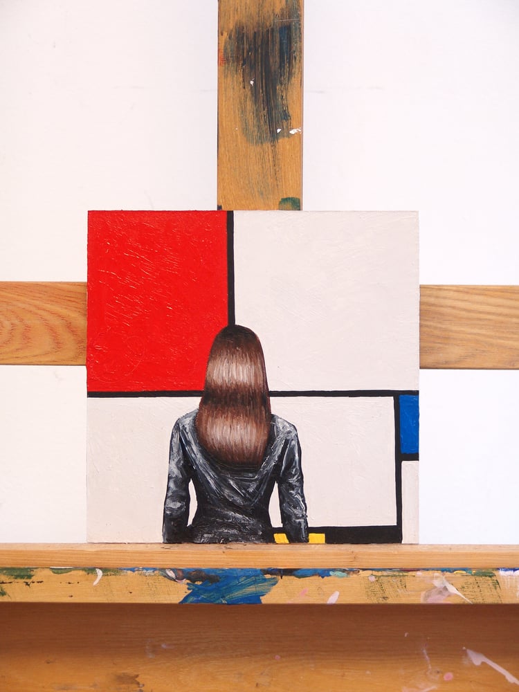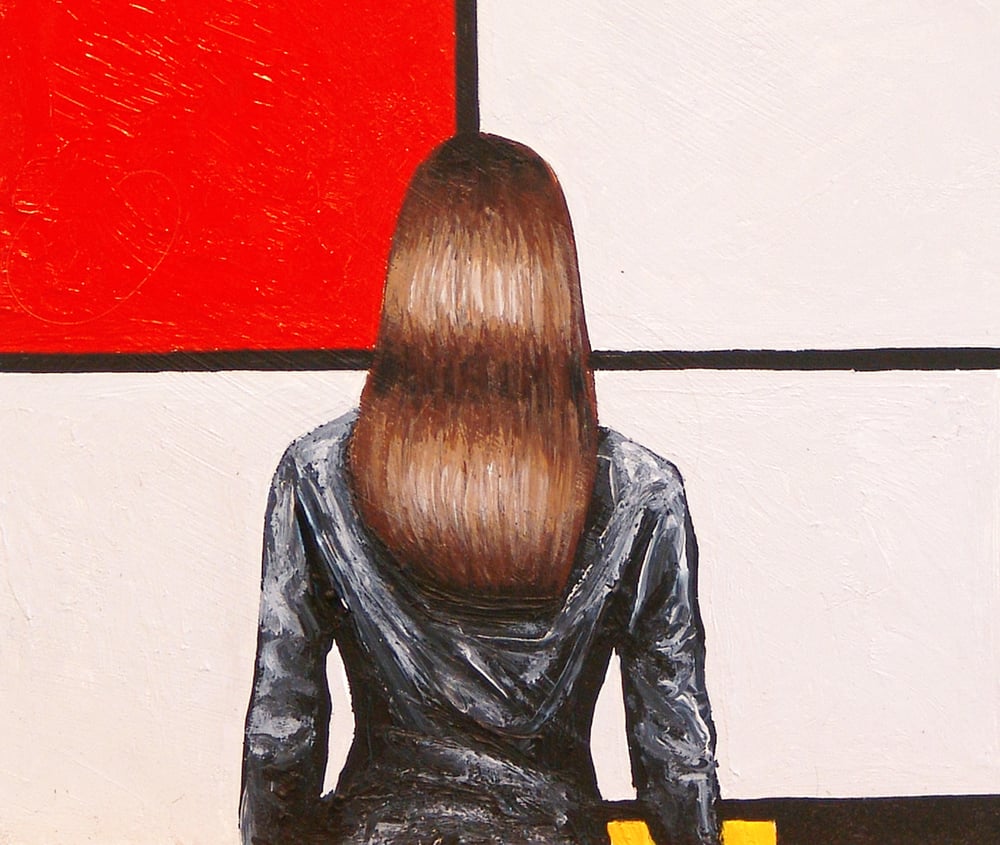 This work of 20 x 20 cm shows a woman enjoying a painting by Piet Mondriaan.