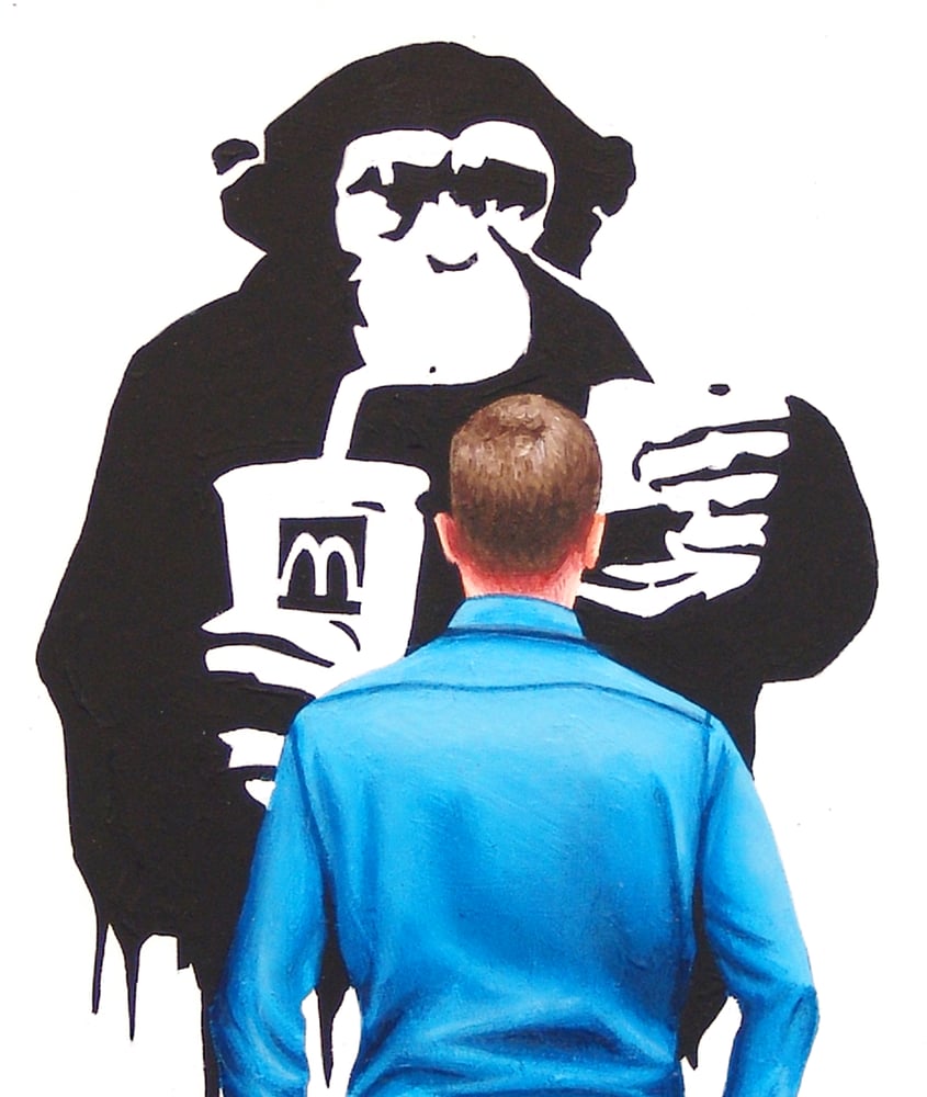 This work of 30 x 30 cm shows a man enjoying a painting by Banksy. As a symbolic stand-in for humanity, the monkey motif acts as a means for Banksy to realize social commentary and criticism.
