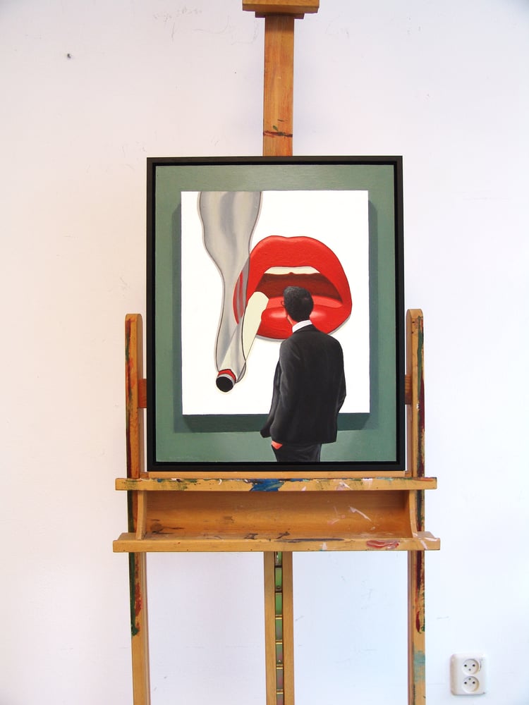 On this painting you see a man enjoying a pop art painting by Tom Wesselmann. His Smoker series uses disembodied, gigantic, and sensual close-ups of a woman's mouth smoking a cigarette. It represents themes of consumerism, desire, and female objectification.