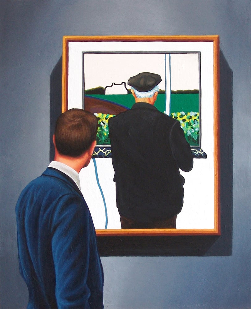 This painting shows a man enjoying a painting by Roger Raveel.