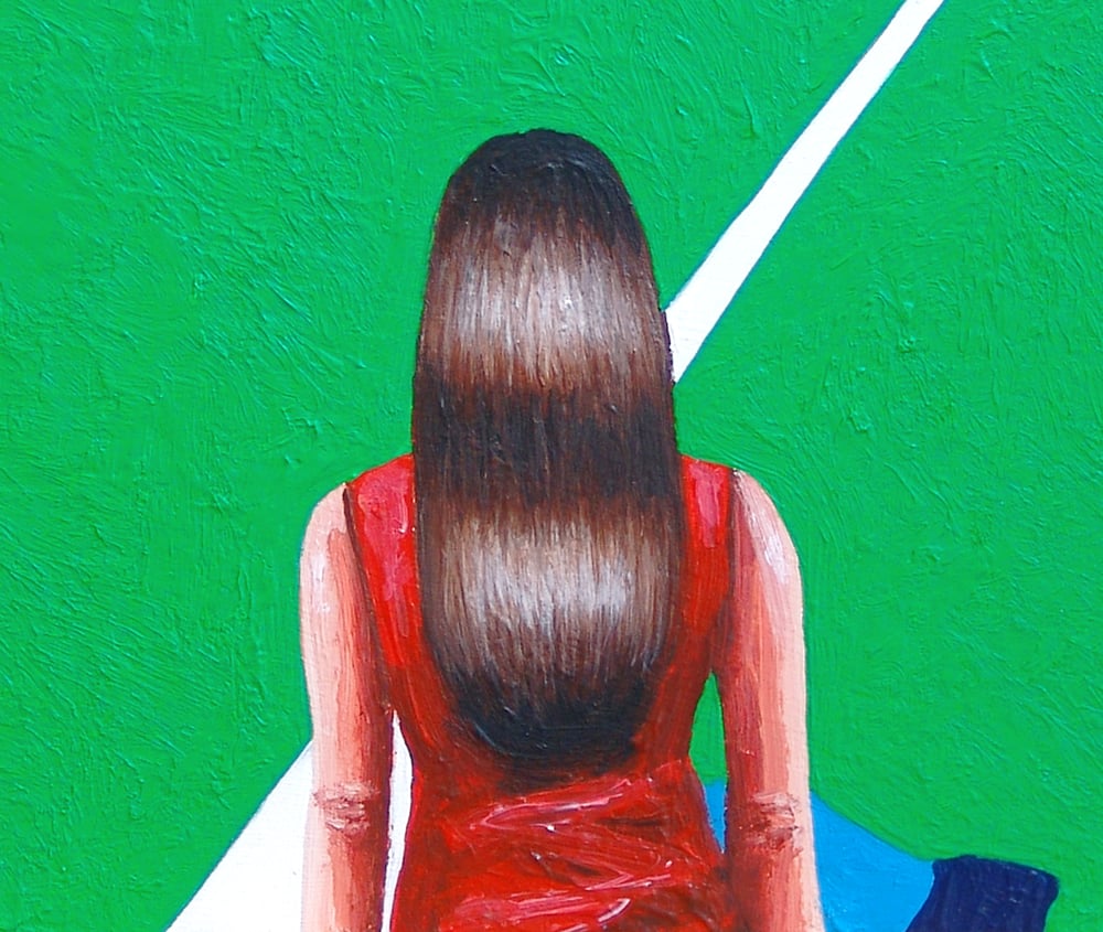 This 20 x 20 cm work depicts a woman enjoying a painting by Raoul de Keyser. De Keyser was a Belgian painter known for subtle, abstract works that bridge the gap between intimate, everyday reality and minimalist form. Often called a "painter's painter," his art explores the fundamental, tactile elements of painting—line, color field, and layered texture—using muted tones and organic shapes.